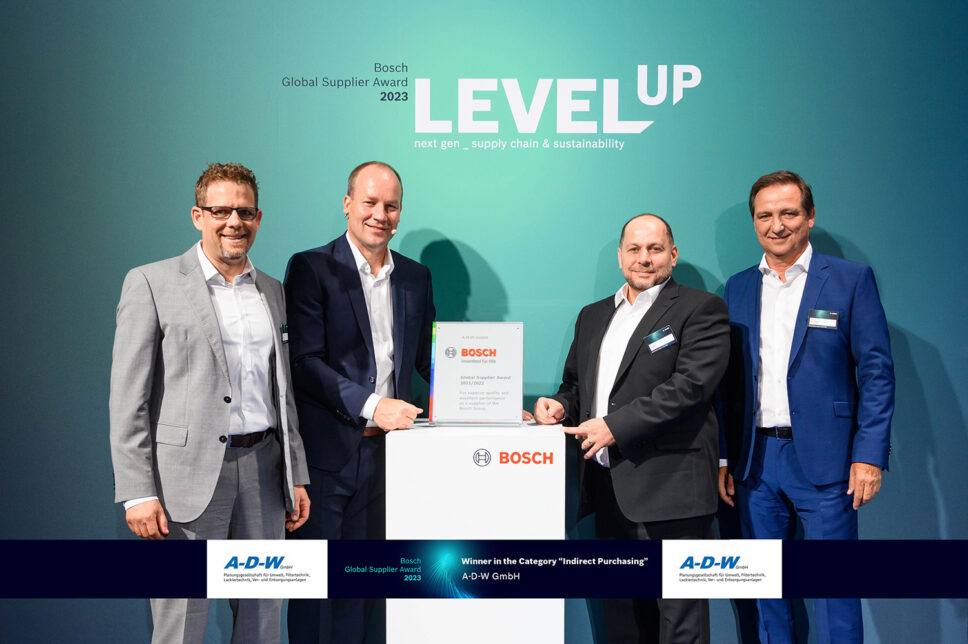 Die A-D-W GmbH zählt zu den weltweit besten Lieferanten von Bosch und erhielt dazu vom Technologie- und Dienstleistungsunternehmen die Auszeichnung „Bosch Global Supplier Award“. A-D-W GmbH bekam die Auszeichnung in der Kategorie „Indirekter Einkauf und Dienstleistungen“. Von seinen rund 35 000 Zulieferern hat Bosch 46 Lieferanten aus 11 Ländern prämiert.