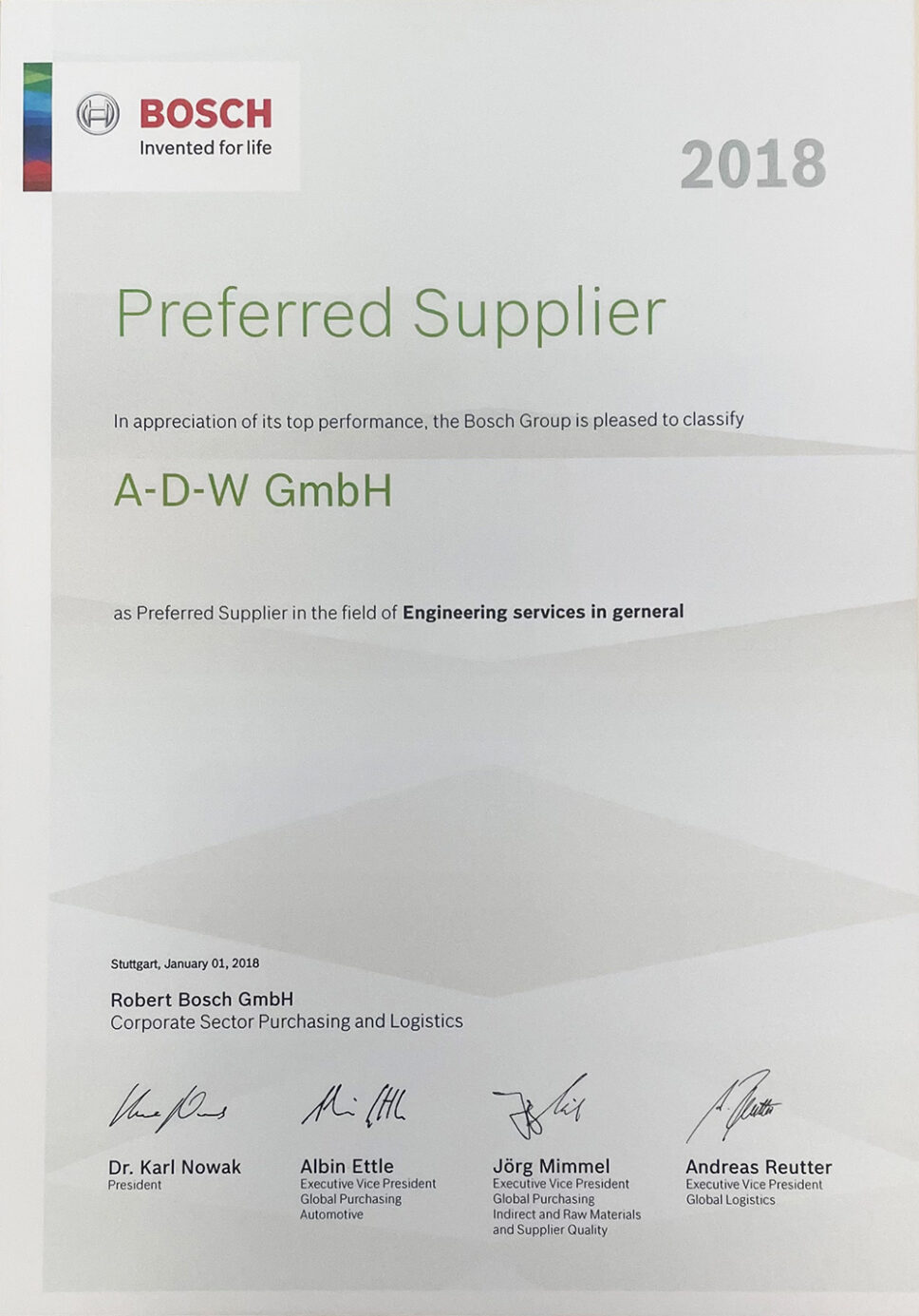 Die Bosch Preferred Supplier Erklärung ist eine besondere Auszeichnung, mit der Bosch seine bevorzugten Lieferanten für herausragende Leistungen würdigt und die Basis einer engen, langfristigen Partnerschaft unterstreicht. Sie wird an Unternehmen verliehen, die in zentralen Bereichen wie Qualität, Zuverlässigkeit, Preis- und Kostenmanagement, Lieferperformance sowie Innovationskraft überdurchschnittliche Ergebnisse erzielen. Die A-D-W GmbH erhielt diese Auszeichnung im Jahr 2018.
